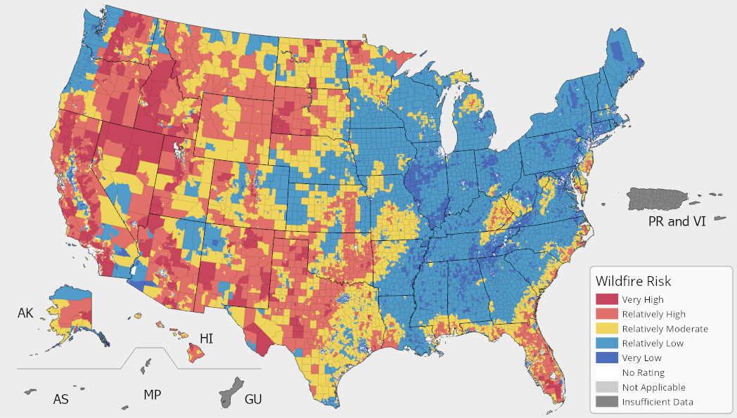 According to FEMA's Wildfire Risk Index, many areas that carry the highest risk of wildfires are located on the West Coast of the U.S., though this risk largely spreads outward to about the middle of the country. Still, many areas along the Gulf and South and East Coasts also have a high risk of developing wildfires. See the map below for more details.
