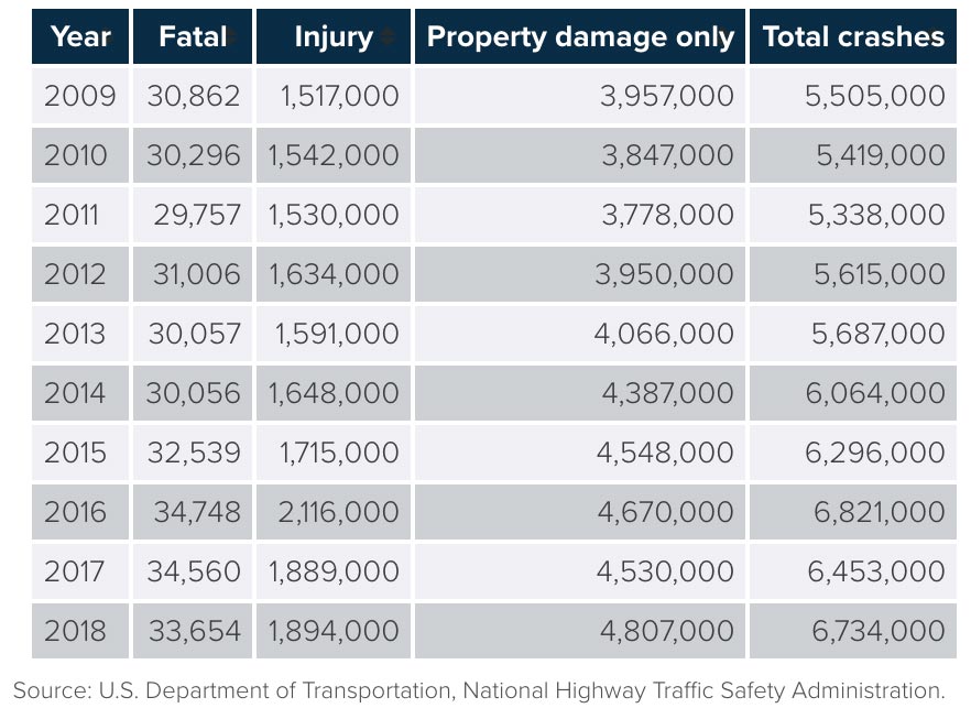 - Of those six million, 1.8 million were bodily injury crashes and 4.8 million were property-damage-only accidents