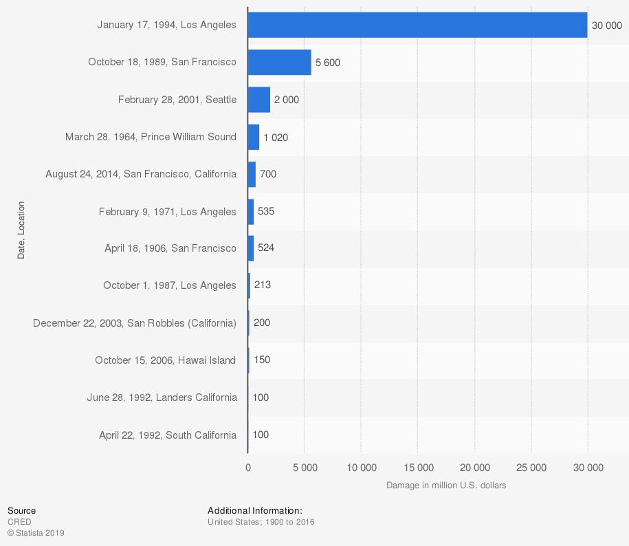 Costliest Earthquakes in the United States from 1900 to 2016, by Economic Damage (in billion US dollars)