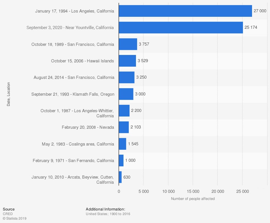When it comes to the effect on the US population, the San Francisco earthquake of 1989 reportedly impacted the lives of 3,757 people total, ranking third overall for the most people affected by an earthquake in over a century of the nation’s history. Ranking above the Loma Prieta earthquake are the 2000 earthquake that struck near Yountville, California, affecting 25,174 people, and the 1994 earthquake that struck Los Angeles, affecting 27,000.