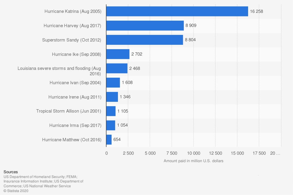 Most Expensive Flood Disasters in the United States from 1978 to 2019, by National Flood Insurance Program (NFIP) Payouts (in billion US dollars)