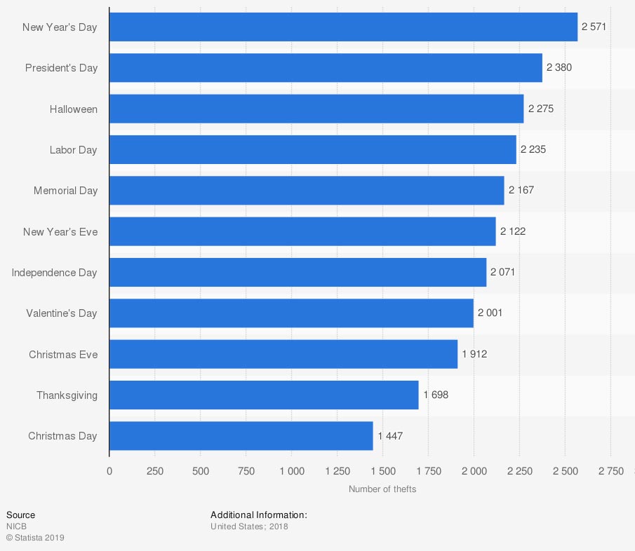 The most frequent occurrence of vehicle theft over the holidays in the year 2018 by far was on New Year’s Day, with a reported 2,571 vehicles stolen that day. Next up, perhaps unexpectedly, was President’s Day, with a reported 2,380 vehicles stolen. Halloween took third place, with 2,275 vehicle thefts reported.