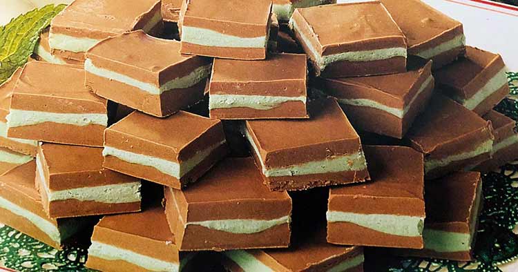 Warm the reserved chocolate mixture if necessary; spread over mint layer. Refrigerate for 1 hour or until firm. Lift out of the pan with foil and remove the foil. Cut into 1” squares. Store in an airtight container in the refrigerator.