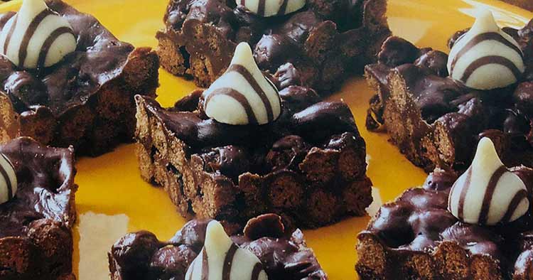 Pour over cereal; stir until well-coated spread evenly in a greased 13” x 9” pan. Arrange kisses in rows over the top. Cool before cutting.