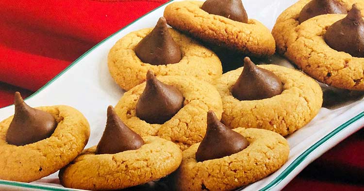 Roll into 1 1/4 inch balls. Place 2 inches apart on an ungreased baking sheet. Bake at 350° for 10-12 minutes or until tops are slightly cracked. Immediately press one chocolate kiss into the center of each cookie. Cool for 5 minutes before removing from pans.