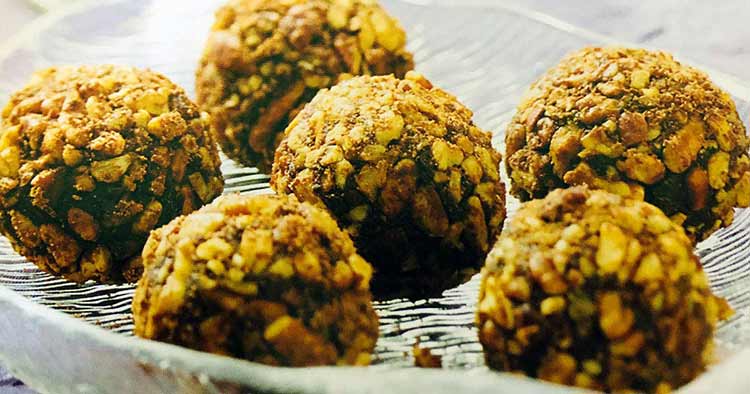 Transfer to a small bowl. Cover and refrigerate until chilled. Form 1” balls and roll in pistachios. Store in the refrigerator.