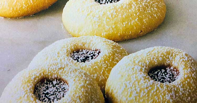 Roll into 1” balls. Place 2” apart on a greased baking sheet. Using the end of a wooden spoon handle, make an indentation in the center of each. Fill each with ¼ teaspoon preserves.