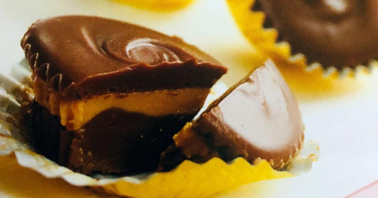 In a microwave or saucepan, heat peanut butter until melted. Spoon into cups. Top with remaining chocolate mixture. Refrigerate for 30 minutes or until firm.