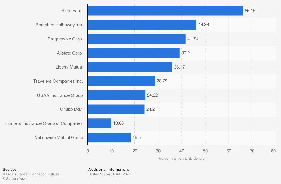 In recent years, State Farm has taken the lead by far in terms of premiums written for business insurance, at $66.15 billion. Next is Berkshire Hathaway, Inc., at 46.36 billion, and then Progressive, at $41.74 billion.