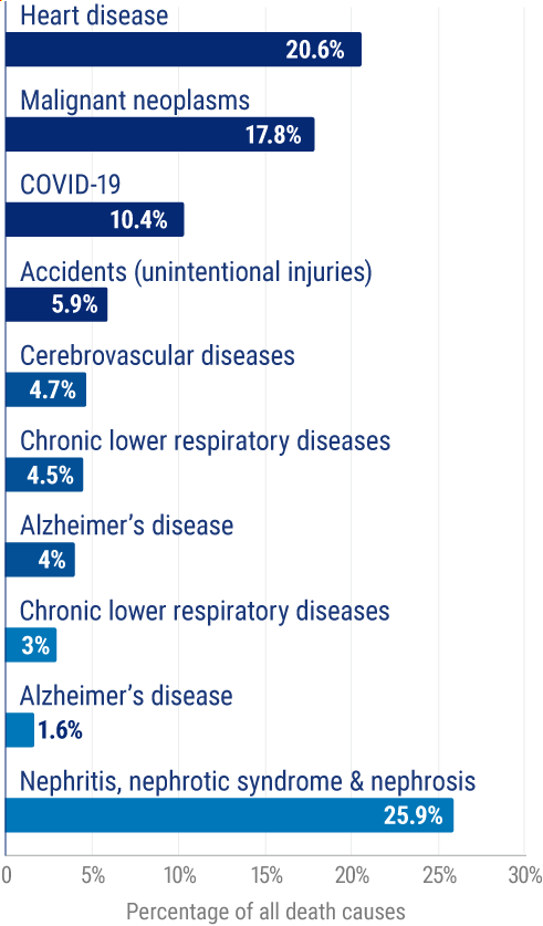 Accidents, or unintentional injuries, are the fifth-leading cause of death in the US currently. Unintentional injuries can apply to a broad range of things, from icy sidewalk slips and falls to incidents of poisoning. While unintentional injuries and accidents account for just under 6% of deaths in the US, heart disease, by comparison, causes more than one-fifth of all deaths.