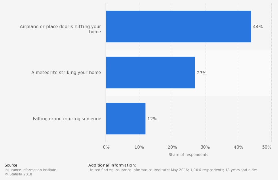 This graph proves that less than half of homeowners surveyed in 2016 believed that their insurance policy provided coverage for falling objects. Only 44% believed homeowners insurance would protect them against airplane or place debris striking their home, 27% believed they’d be protected against impact from a meteorite, and just 12% believed they’d be covered against a rogue drone attack.