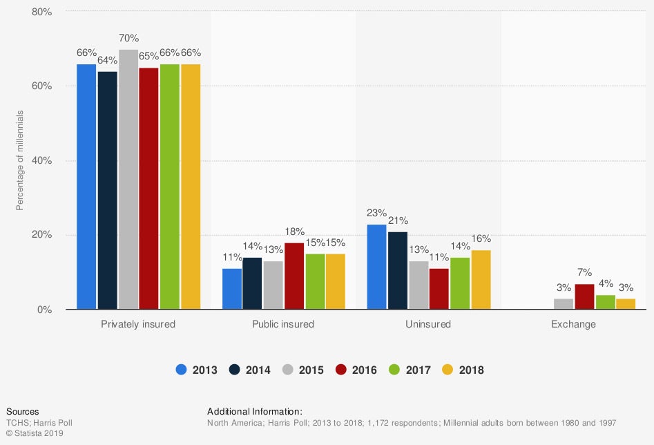 A survey done in 2019 showed millennials who had health insurance. According to the survey, 66% of this younger generation obtained private health insurance, with 16% being uninsured altogether.